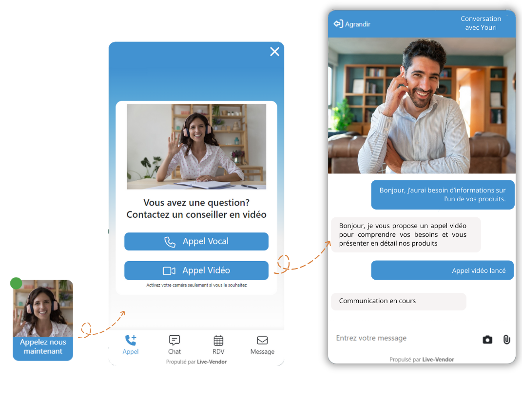 Lorsque vos visiteurs arrivent sur votre site web, ils peuvent lancer un appel vidéo instantané avec un de vos représentants. Cette interaction humaine directe crée une expérience engageante et personnelle, essentielle pour convertir des prospects en clients.